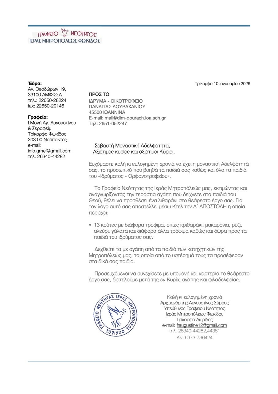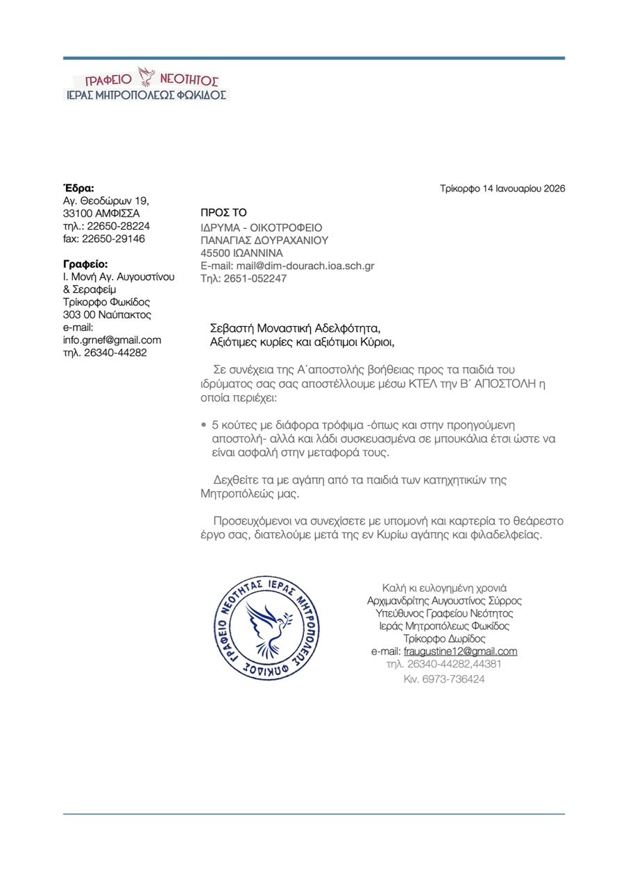 Το Γραφείο Νεότητας της Ιεράς Μητροπόλεώς μας απέστειλε στο Οικοτροφείο της Ιεράς Μονής Παναγίας Δουραχανίου* Ιωαννίνων δύο αποστολές βοήθειας προς τα παιδιά που Οικοτροφείου της Ιεράς Μονής, μία την 12η και μία την 14η του μηνός Ιανουαρίου 2026. Σύνολον και οι δύο αποστολές περιείχαν 18 κούτες με διάφορα τρόφιμα, όπως κριθαράκι, μακαρόνια, ρύζι, αλεύρι, γάλατα, λάδι και διάφορα άλλα τρόφιμα καθώς και δώρα προς τα παιδιά του ιδρύματος.