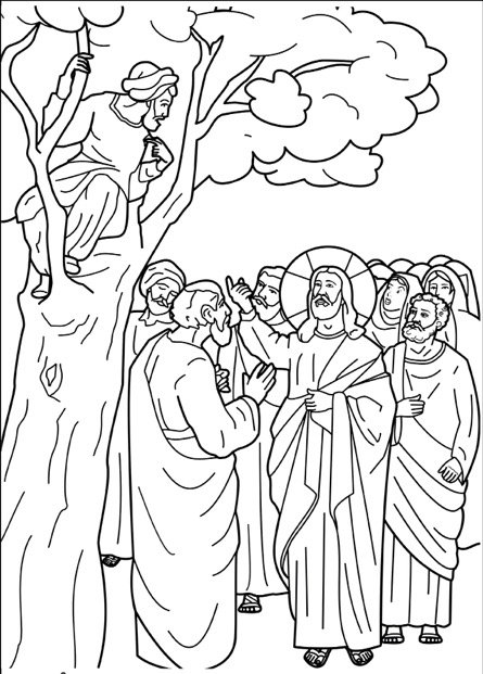 Δίνεται εκτυπωμένη η εικόνα όπου ο Ζακχαίος εικονίζεται πάνω στην συκομουριά και δίπλα του βρίσκεται ο Χριστός. Αν θέλουμε κάτι με περισσότερη φαντασία, μοιράζουμε στα παιδιά την δεύτερη εικόνα και τους ζητάμε να ζωγραφίσουν τον εαυτό τους στην θέση του Ζακχαίου.