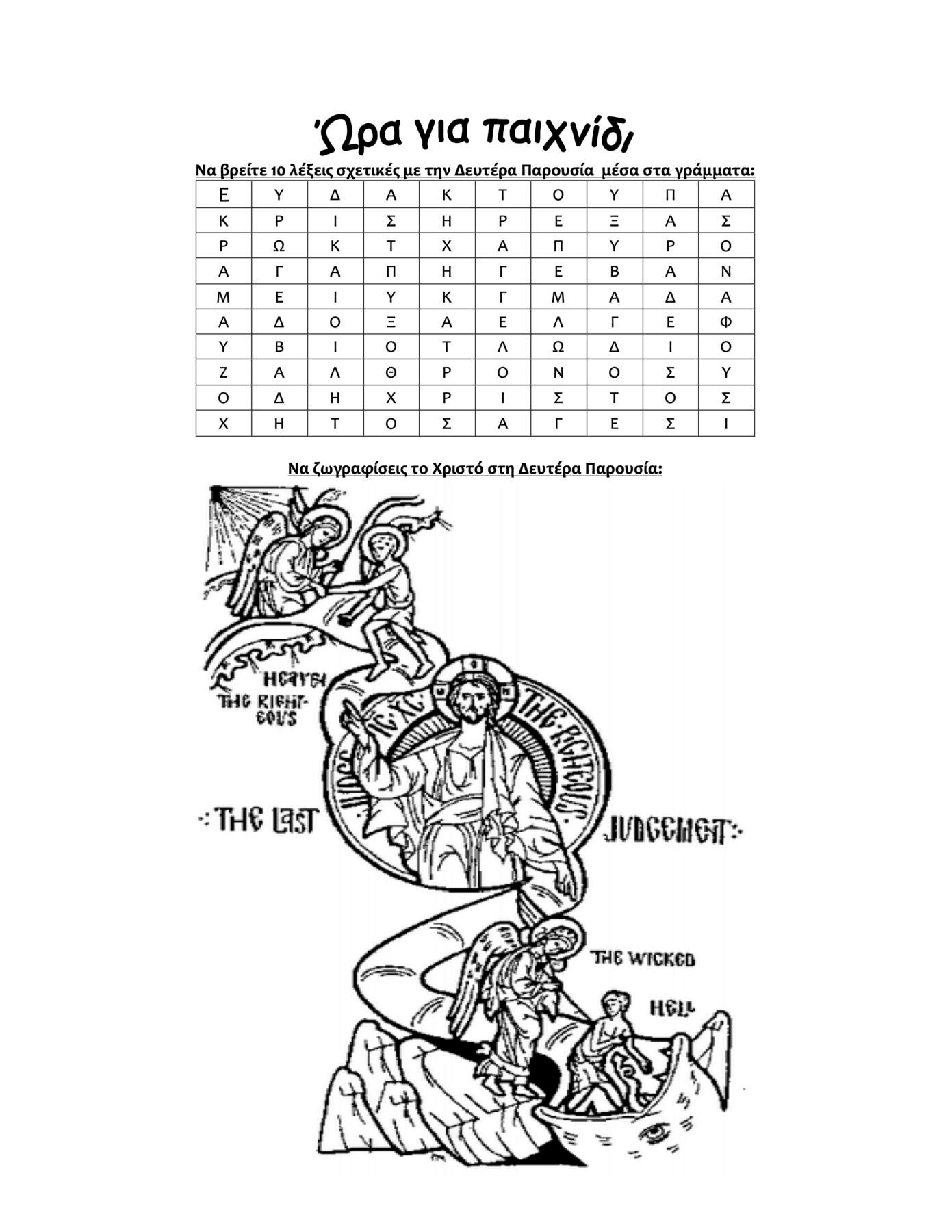 Και   θα   πάνε   τούτοι   σε   κόλαση   αιώνια   και   οι   δίκαιοι   σε   ζωή   αιώνια:   Είναι   απόλυτη   η   Κρίση   που   εφαρμόζει   ο    Δίκαιος    Κριτής    Χριστός    και    κριτήριό    Του    είναι    μόνο    και    μόνο    η    αγάπη!    Δεν    πρέπει    να    φοβόμαστε    για    τη    Δευτέρα   Παρουσία.   Η   αγάπη   είναι   το   ομορφότερο   δώρο   του   Θεού   στον   άνθρωπο   και   μπορούμε   με   απλό   τρόπο    να    ζήσουμε    την    χαρά    και    την    αιωνιότητα    κοντά    στο    Χριστό.    Από    την    παιδική    μας    ηλικία    λοιπόν    ας    προσπαθούμε    να    δείξουμε    αγάπη.    Να    μοιραζόμαστε    αυτό    που    έχουμε.    Να    συγχωρούμε.    Να    δείχνουμε    καλοσύνη.   Να   στηρίζουμε   τους   άλλους.   Να   μην   κάνουμε   κακό,   αλλά   και   να   βλέπουμε   στο   πρόσωπό   τους   ότι   ο    Χριστός    βρίσκεται    σ’   αυτούς,    όπως   και    σε    μας.    Και    όταν    μεγαλώσουμε,    να   κάνουμε   ελεημοσύνη.   Πρωτίστως    όμως   να   προσευχόμαστε   στο   Θεό   για   όλους.   Και   η   προσευχή   είναι   αγάπη   και   μάλιστα   αληθινή   και   μοναδική.   Ο    κόσμος   και   η   εποχή   μας   έχει   ως   κριτήριο   το   μασκάρεμα,   να   μην   φαίνεται   δηλαδή   το   αληθινό   μας   πρόσωπο   για    να    διασκεδάζουμε.    Ο    χριστιανός    έχει ως    κριτήριο    να    μπολιάζει    το    αληθινό    του    πρόσωπο    με    την    αγάπη    στο    Χριστό.   Κι   αυτή   η   αγάπη   δίνει   αιώνια   ζωή.   Ας   το   παλέψουμε   από   την   παιδική   μας   ηλικία.