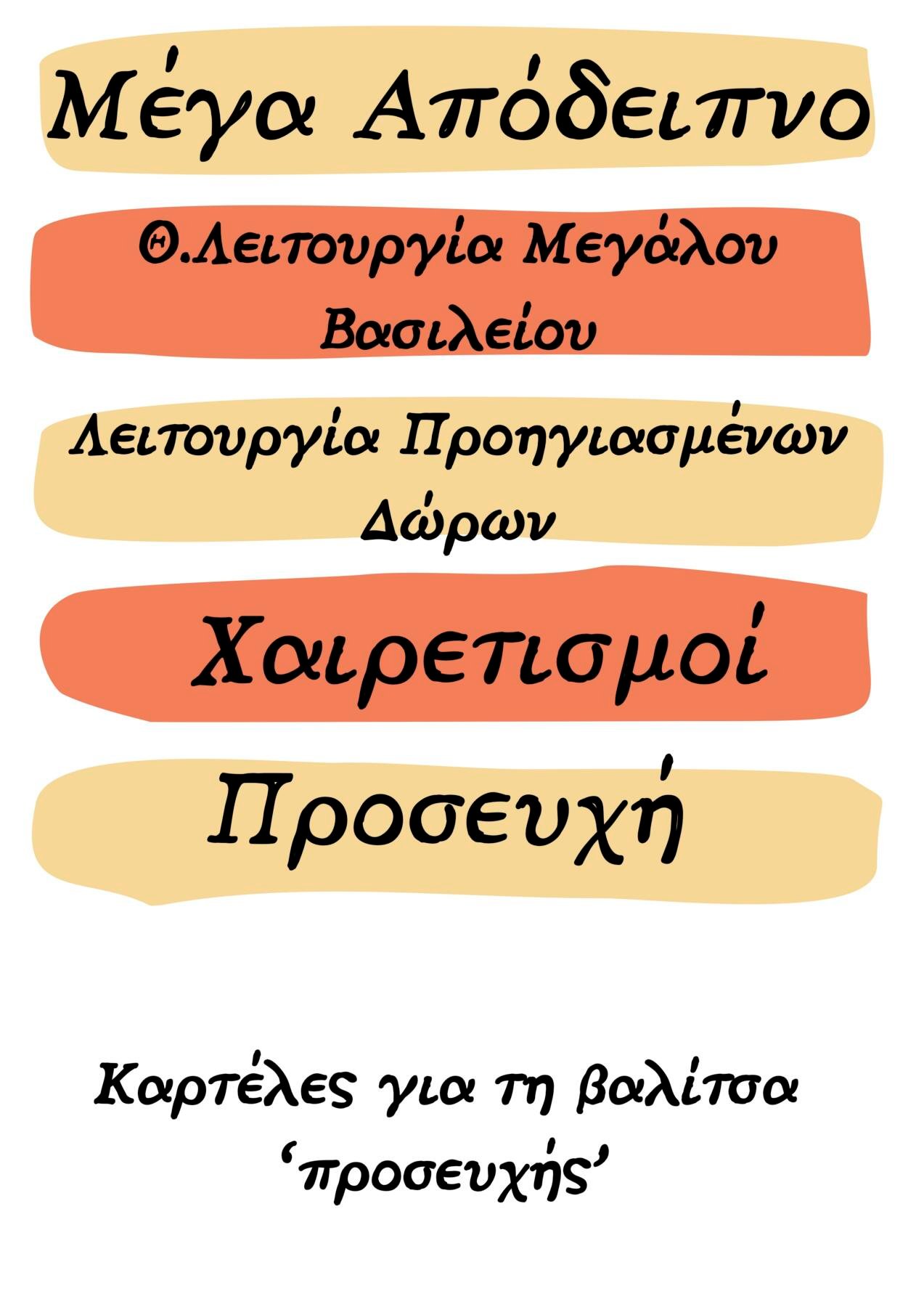 Η ΔΕΥΤΕΡΗ βαλίτσα (δείχνουμε τη βαλίτσα που είναι γραμμένη η λέξη «προσευχή») που χρειαζόμαστε σε αυτό το ταξίδι είναι η «προσευχή». Στην περίοδο της Σαρακοστής, η Εκκλησίας μας καλεί να προσευχόμαστε περισσότερες φορές μέσα στη μέρα. Γι’ αυτόν τον λόγο έχει ορίσει κάποιες ακολουθίες. Γνωρίζετε ποιες είναι αυτές; Πολύ σωστά (Βγάζουμε τις καρτέλες με τις ακολουθίες,  τις παρουσιάζουμε μια- μια και ζητάμε από τα παιδιά να τις βάλουν μέσα στη βαλίτσα)!